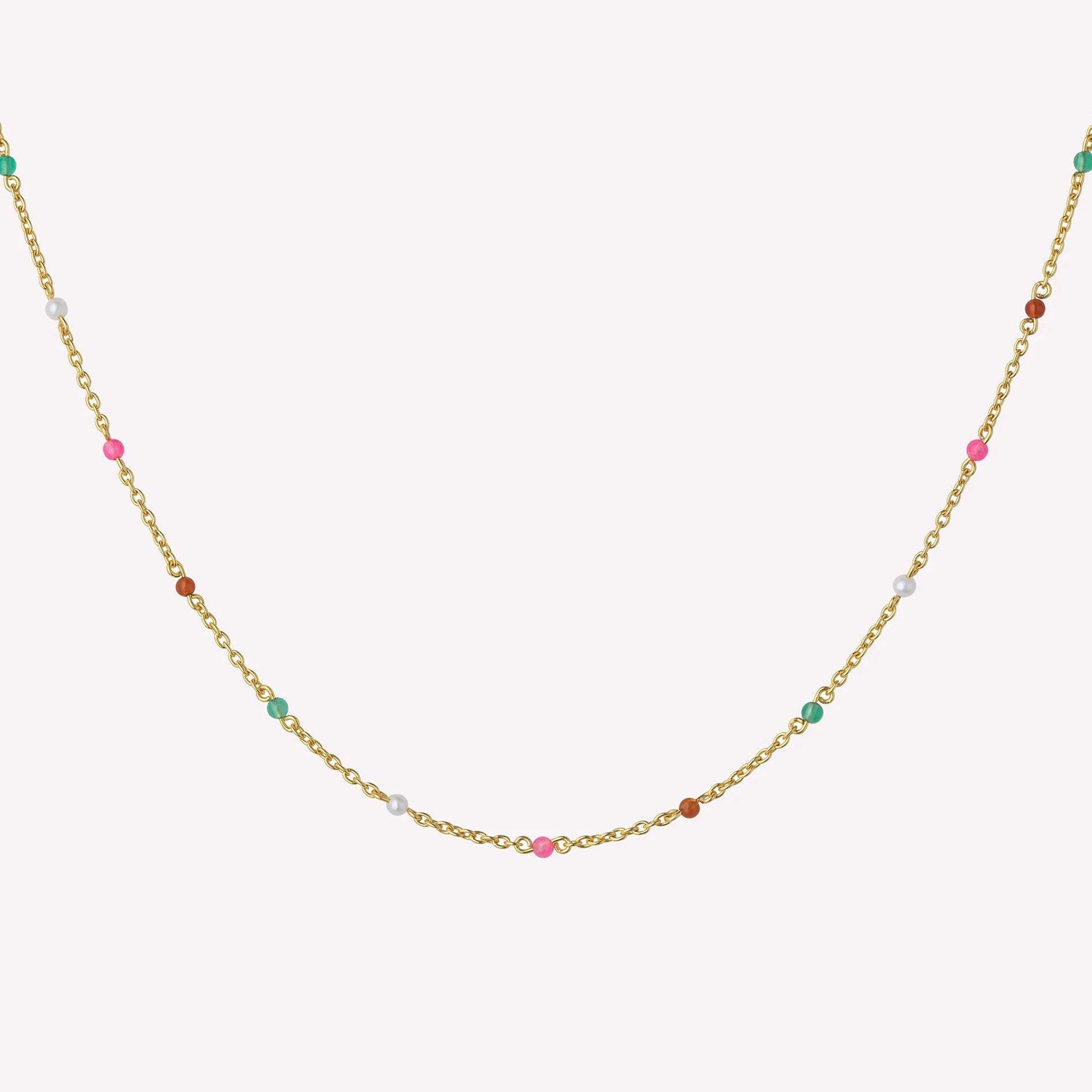 Kette Gold 3-3401m-GP. Material: 14K vergoldet, Sterlingsilber mit Süßwasserperlen, rotem Achat, grünem Achat und rosafarbener Jade. L: verstellbar bis 45 cm.